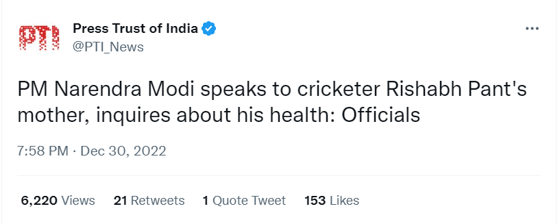 ऋषभ पंत के एक्सीडेंट की जानकारी मिलने के बाद प्रधानमंत्री मोदी ने उनके जल्द स्वस्थ होने की कामना की। प्रधानमंत्री मोदी ने एक ट्वीट में लिखा कि जाने माने क्रिकेटर ऋषभ पंत के हादसे से व्यथित हूं। मैं उनके अच्छे स्वास्थ्य और कल्याण के लिए प्रार्थना करता हूं।