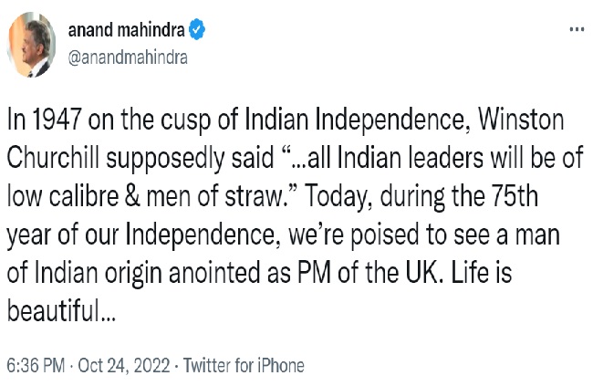 आनंद महिंद्रा ने ट्वीट कर कहा, '1947 में भारत की आजादी के दौरान विंस्टल चर्चिल ने कहा था कि भारत के नेता कम क्षमता वाले होंगे।' महिंद्रा ने आगे कहा कि आज हमारी आजादी के 75वें साल में हम भारतीय मूल के व्यक्ति को ब्रिटेन का पीएम के रूप में देखने के लिए तैयार हैं। जिंदगी खूबसूरत है...