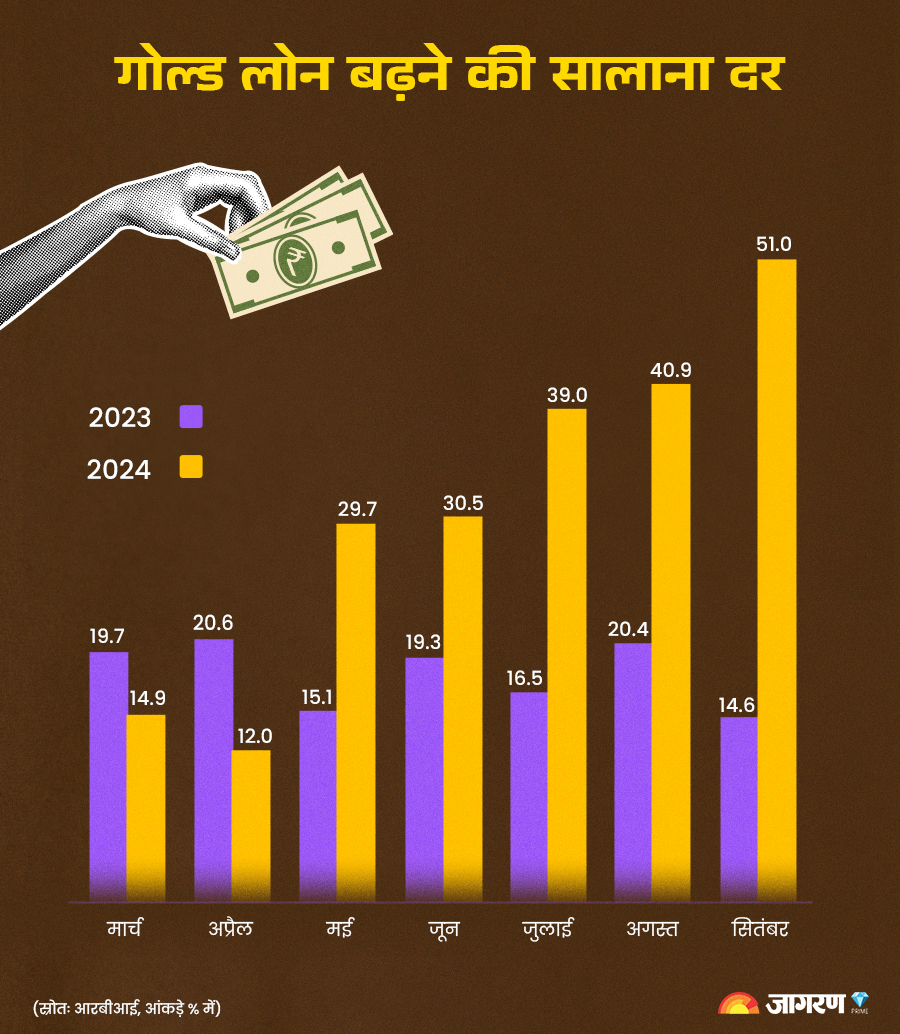 सितंबर में गोल्ड लोन 51% बढ़ा। गोल्ड लोन का 63% कारोबार असंगठित क्षेत्र में होता है और 77% गोल्ड लोन ग्रामीण और अर्ध शहरी इलाकों में लिए जाते हैं। कार...और पढ़ें