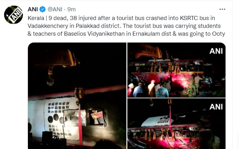 बुधवार की रात यहां वडक्कनचेरी के पास मंगलम में स्कूली छात्रों को ले जा रही एक पर्यटक बस ने केएसआरटीसी की बस को पीछे से टक्कर मार दी। टक्कर लगने के बाद बस दलदल में गिर गई। इसमें नौ लोगों की मौत हो गई और कई अन्य घायल हो गए। करीब 38 घायलों को इलाज के लिए विभिन्न अस्पतालों में भर्ती कराया गया है। कई की हालत नाजुक बनी हुई है।