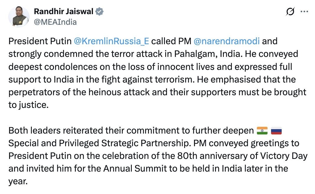 राष्ट्रपति पुतिन ने प्रधानमंत्री मोदी को फोन किया और भारत के पहलगाम में हुए आतंकी हमले की कड़ी निंदा की। उन्होंने निर्दोष लोगों की मौत पर गहरी संवेदना व्यक्त की और आतंकवाद के खिलाफ लड़ाई में भारत को पूरा समर्थन देने की बात कही।