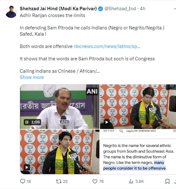 शहजाद पूनावाला ने ट्वीट किया है, " अधीर रंजन चौधरी के इस बयान से पता चलता है कि शब्द भले ही सैम पित्रोदा के थी, लेकिन भारतीयों को चीनी/अफ्रीकी/नेग्रिटो/काला कहने की ये सोच कांग्रेस की है। इसलिए उन्होंने चमड़ी के रंग पर लोगों को बांटा है। यह सिर्फ अंकल सैम की सोच नहीं है यह पूरे गांधी परिवार की सोच है। उन्होंने राष्ट्रपत्नी द्रौपदी मुर्मु को भी अपमानित किया है।