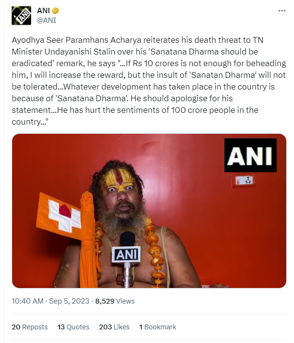 संत परमहंस आचार्य ने अपनी बात दोहराई और समाचार एजेंसी ANI से कहा, 'अगर 10 करोड़ रुपये उनका सिर काटने के लिए पर्याप्त नहीं हैं, तो मैं इनाम बढ़ा दूंगा, लेकिन 'सनातन धर्म' के अपमान को बर्दाश्त नहीं किया जाएगा। उन्होंने कहा कि देश में जो भी विकास हुआ है वह 'सनातन धर्म' की वजह से हुआ है। उदयनिधि को अपने बयान के लिए माफी मांगनी चाहिए। उन्होंने देश के 100 करोड़ लोगों की भावनाओं को ठेस पहुंचाई है।'