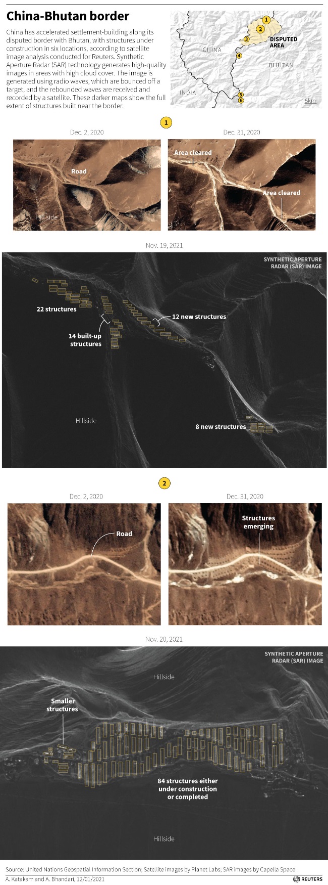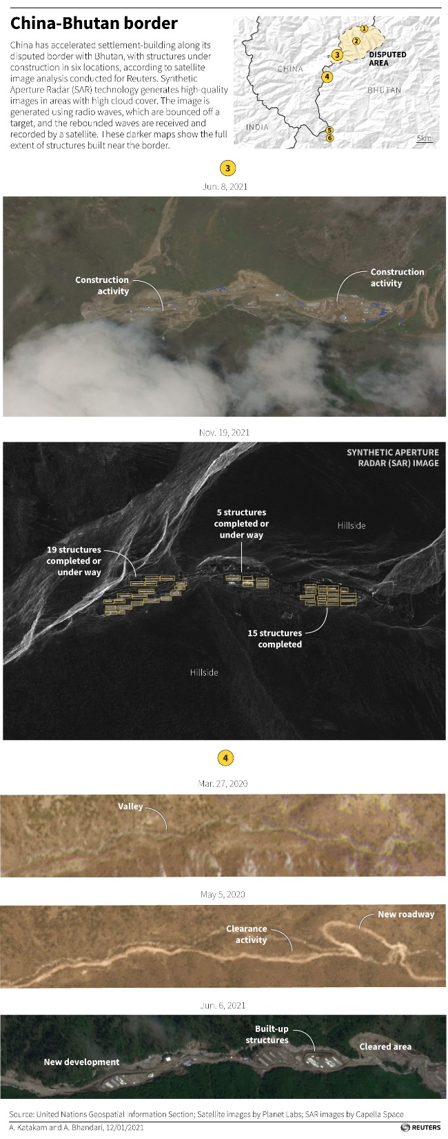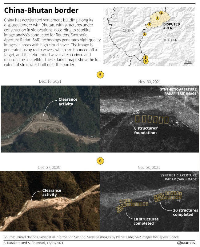 क्रिस बिगर्स (Chris Biggers) ने कहा कि तस्वीरों से साफ है कि साल 2021 से काम में तेजी आई है। पहले छोटे ढांचे बनाए गए थे (संभवतः निर्माण सामग्रियों और आपूर्ति के लिए) इसके बाद नींव रखी गई और फिर इमारतों का निर्माण किया गया। कैपेला स्पेस (Capella Space) द्वारा नए निर्माण के स्थानों और हाल ही में ली गई उपग्रह छवियों का अध्ययन करने वाले दो अन्य विशेषज्ञों ने कहा कि सभी छह बस्तियां चीन और भूटान द्वारा विवादित क्षेत्र में प्रतीत होती हैं। इसमें लगभग 110 वर्ग किलोमीटर का एक विवादित क्षेत्र भी शामिल है। इस इलाके में आबादी न के बराबर है।
