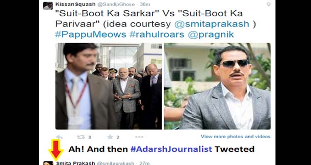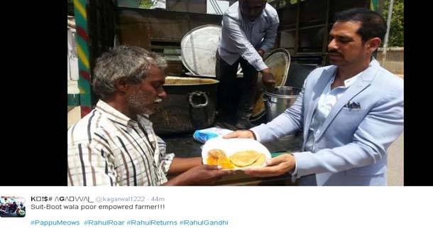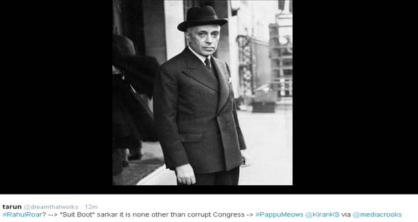 कांग्रेस विरोधियों ने राहुल के सूट-बूट वाले बयान पर टि्वटर पर रॉबर्ट वाड्रा और नेहरू जी कि सूट पहने हुए ली गई तस्वीर अपलोड कर कहा है कि कांग्रेस है सूट-बूट वाली सरकार। इतना ही नहीं जब सोनिया गांधी ने राहुल के भाषण की तारीफ की तो इसे भी मजाक का विषय बना दिया गया।