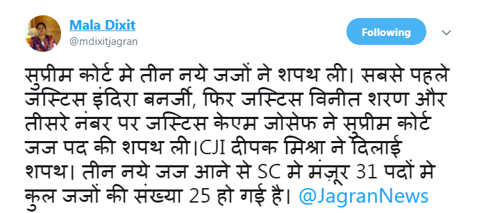 नई दिल्ली (जेएनएन)। तमाम विवादों के बीच मंगलवार को उत्तराखंड हाई कोर्ट के चीफ जस्टिस केएम जोसेफ सुप्रीम कोर्ट में जस्टिस के तौर पर शपथ ली। वरिष्ठता के आधार पर जस्टिस इंदिरा बनर्जी, विनीत सरन और केएम जोसेफ शपथ ग्रहण कियागे। इसी के साथ सुप्रीम कोर्ट को तीन नये जस्टिस मिल गए हैं।