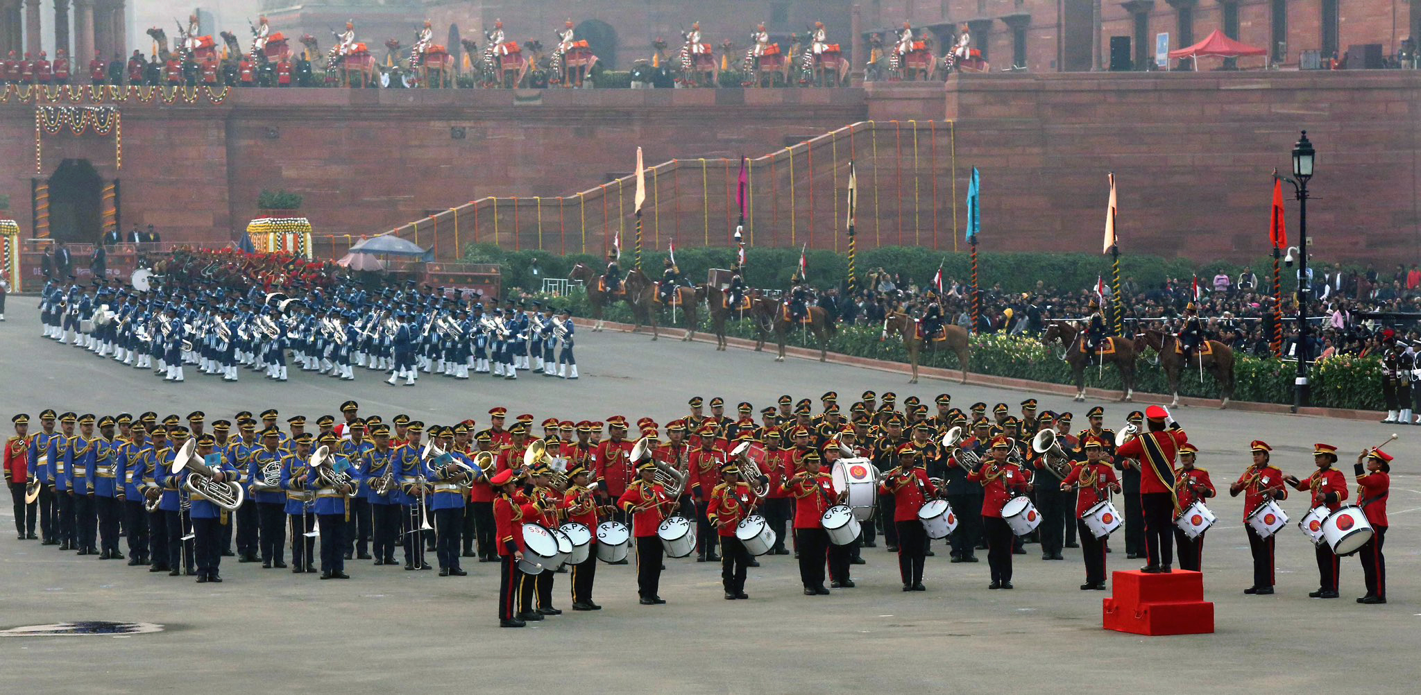 सोमवार को नई दिल्ली के विजय चौक पर बीटिंग रिट्रीट समारोह के दौरान त्रि-सेवा बैंड ने प्रदर्शन किया।