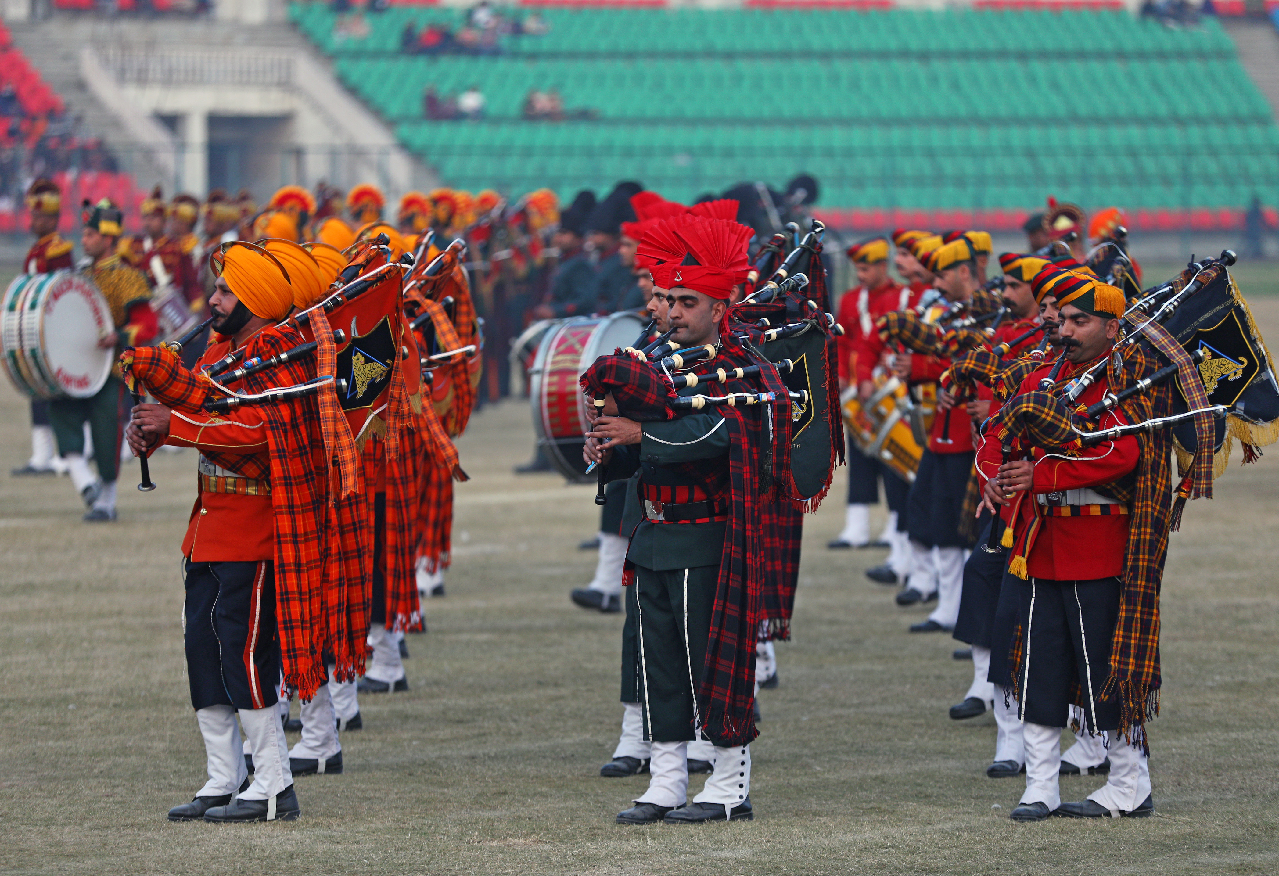 भारतीय सेना और जम्मू-कश्मीर पुलिस बैंड दल ने सोमवार को जम्मू के मौलाना आजाद स्टेडियम में बीटिंग रिट्रीट समारोह के दौरान प्रदर्शन किया।