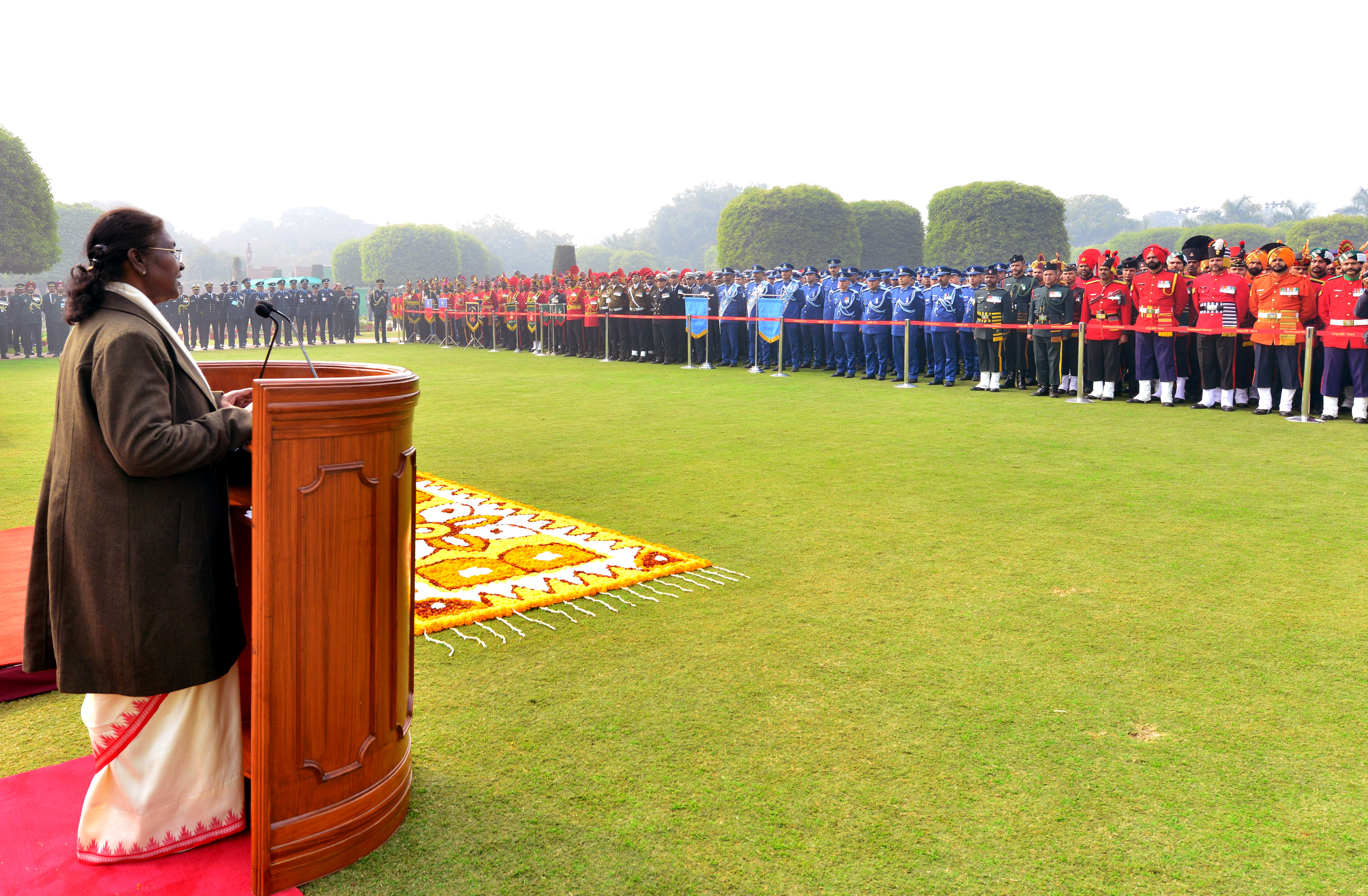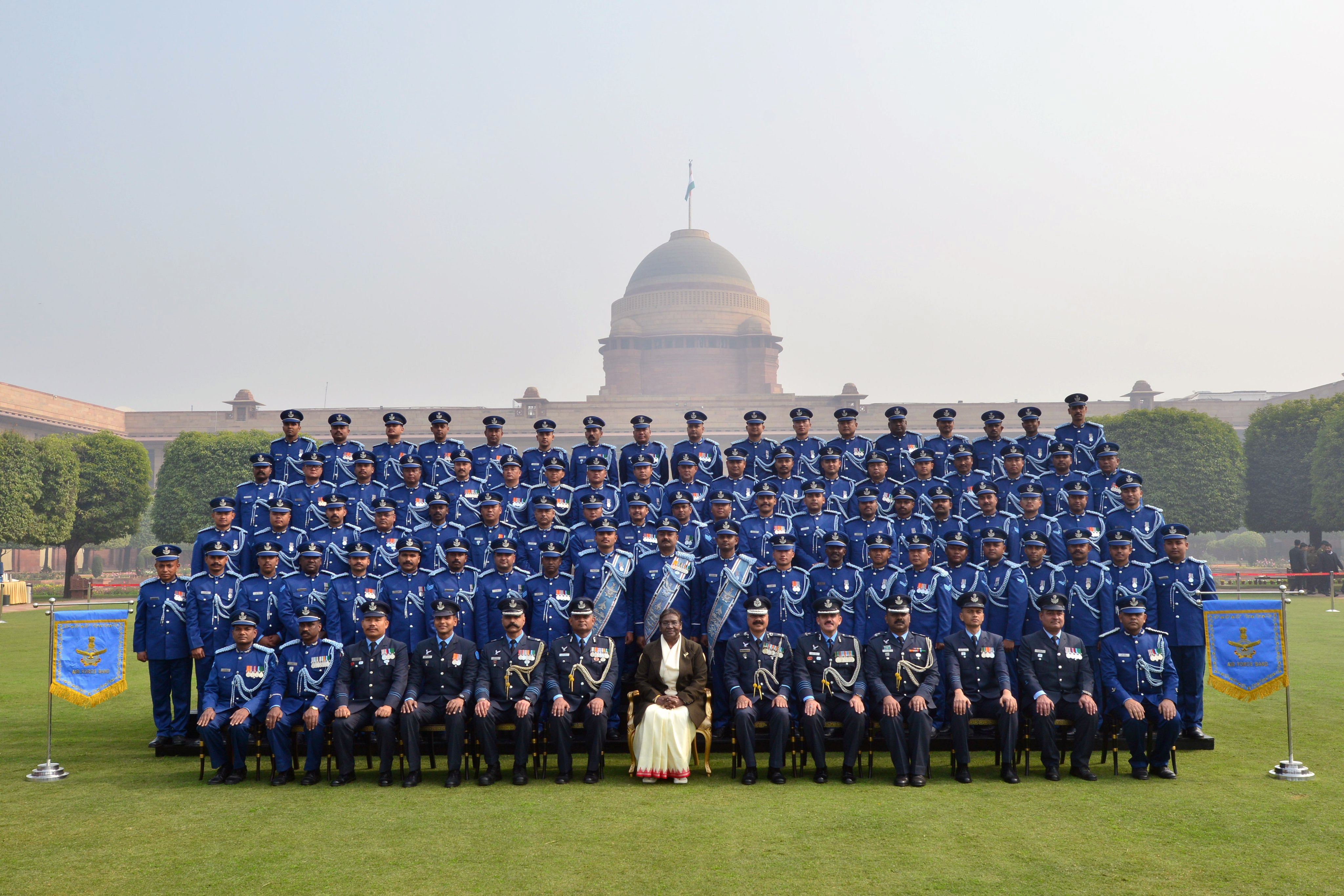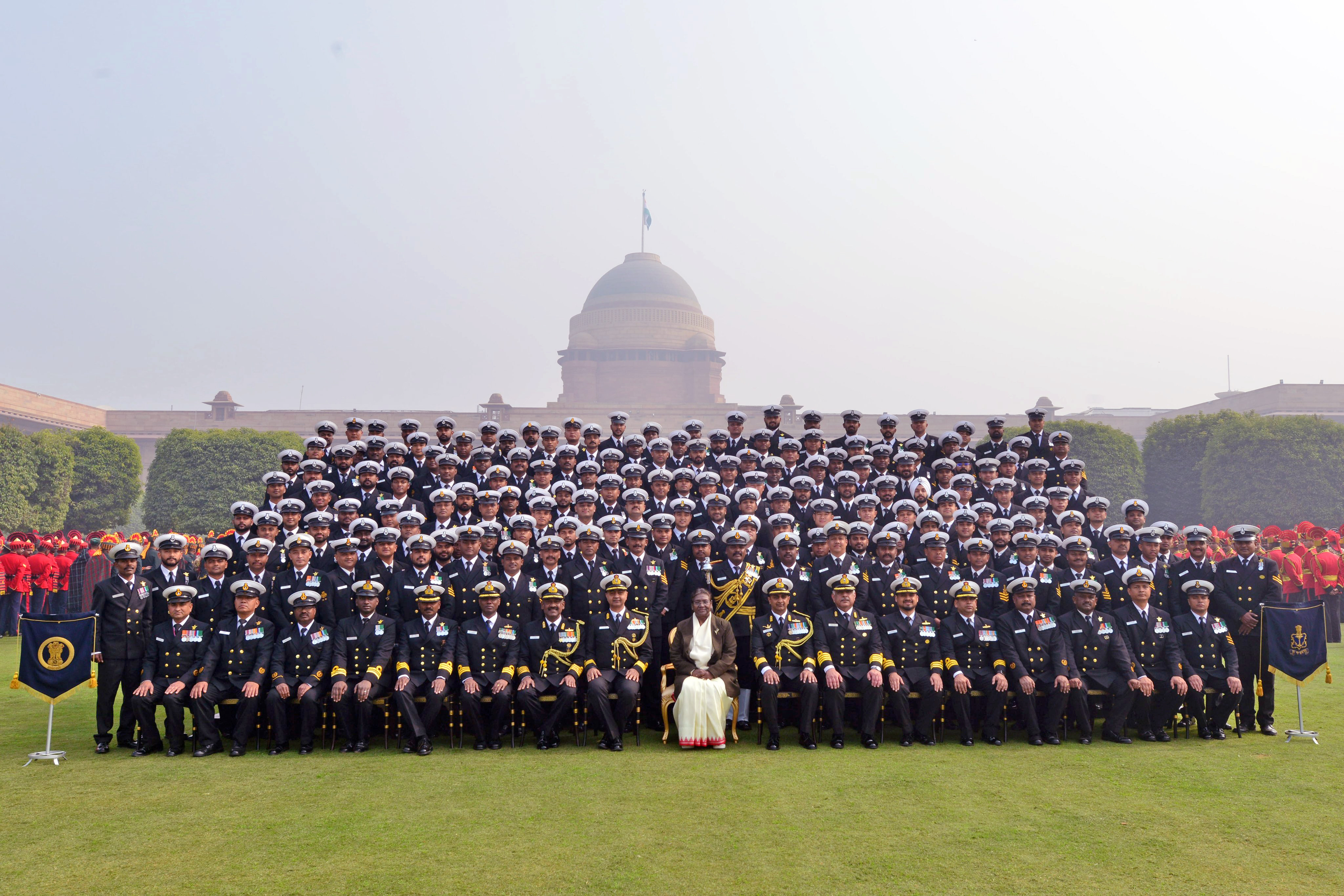 राष्ट्रपति द्रौपदी मुर्मु त्रि-सेवा बैंड टुकड़ियों के साथ एक समूह तस्वीर के लिए पोज देते हुए देखी गईं।