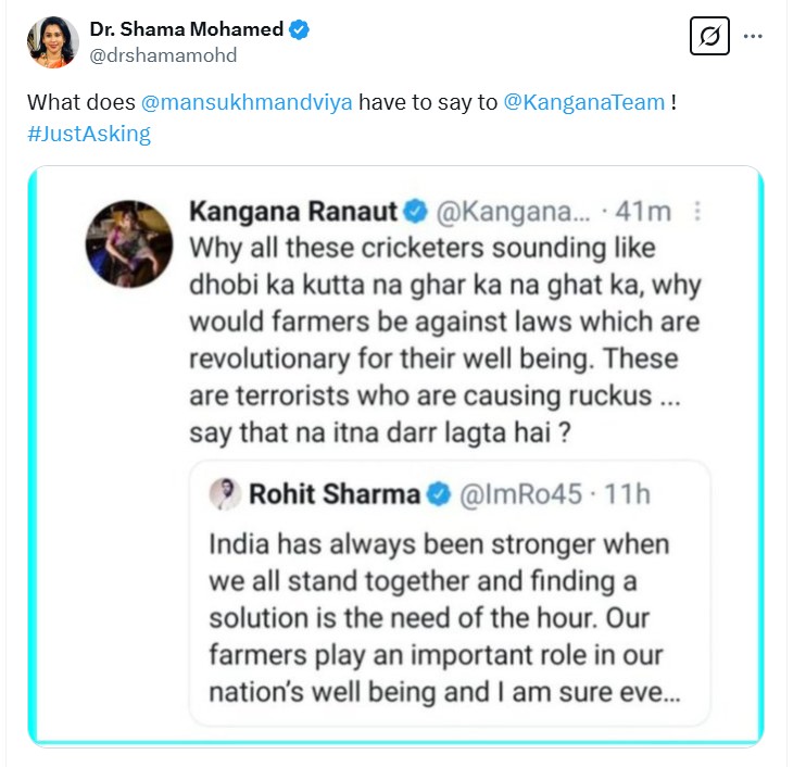 बता दें कि रोहित शर्मा पर किए गए भद्दे कमेंट के बाद शुरू हुए विवाद के बाद भी शमा मोहम्मद पीछे हटते नहीं दिख रही हैं। उन्होंने अभिनेत्री और सांसद कंगना रनौत का एक पुरान एक्स पोस्ट साझा कर केंद्रीय खेल मंत्री मनसुख मंडाविया से सवाल किया। उन्होंने कहा कि मनसुख जी अब आप कंगना रनौत के बारे में क्या कहेंगे?