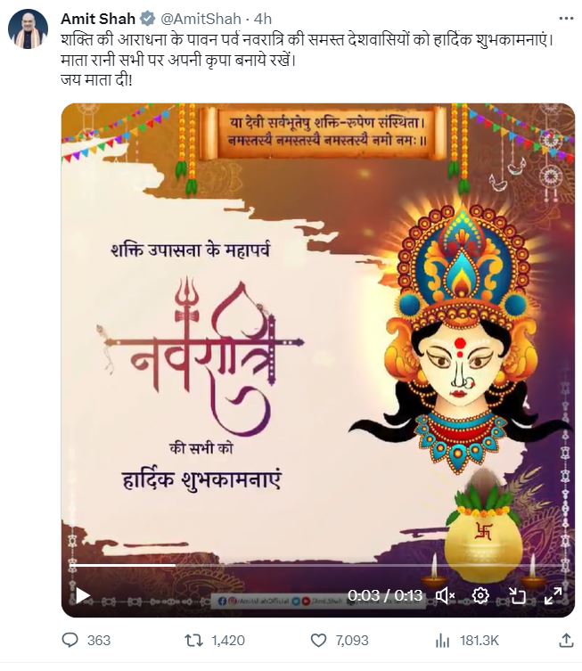 केंद्रीय गृह मंत्री अमित शाह ने नवरात्र की हार्दिक शुभकामनाएं देते हुए एक्स पर पोस्ट कर कहा, "शक्ति की आराधना के पावन पर्व नवरात्र की समस्त देशवासियों को हार्दिक शुभकामनाएं। माता रानी सभी पर अपनी कृपा बनाये रखें। जय माता दी!"