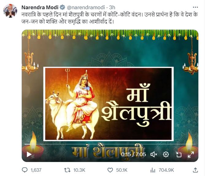 पीएम मोदी ने एक्स पर शुभकामना संदेश पोस्ट करते हुए कहा, "नवरात्र के पहले दिन मां शैलपुत्री के चरणों में कोटि-कोटि वंदन। उनसे प्रार्थना है कि देश के जन-जन को शक्ति और समृद्धि का आशीर्वाद दें।"