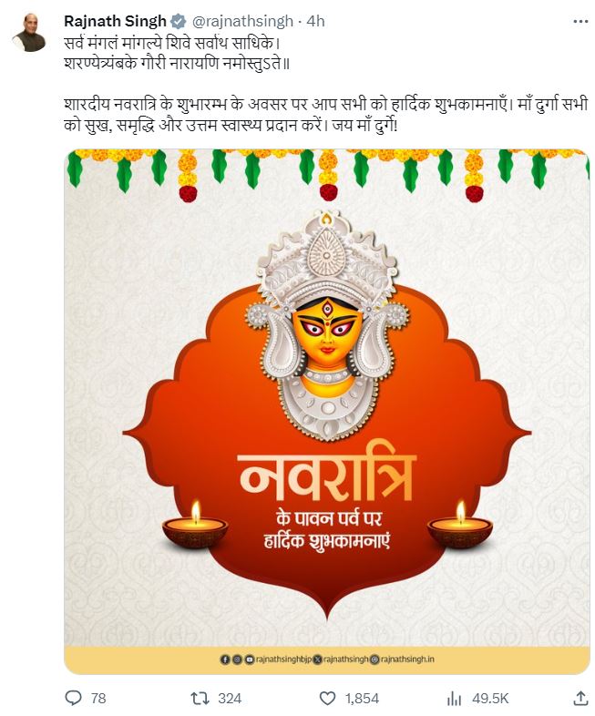 रक्षा मंत्री राजनाथ सिंह ने नवरात्र की बधाई देते हुए ट्वीट किया। सोशल मीडिया पर नवरात्र की शुभकामनाएं देते हुए लिखा, सर्व मंगलं मांगल्ये शिवे सर्वाथ साधिके। शरण्येत्र्यंबके गौरी नारायणि नमोस्तुऽते॥ शारदीय नवरात्रि के शुभारम्भ के अवसर पर आप सभी को हार्दिक शुभकामनाएँ। माँ दुर्गा सभी को सुख, समृद्धि और उत्तम स्वास्थ्य प्रदान करें। जय माँ दुर्गे!