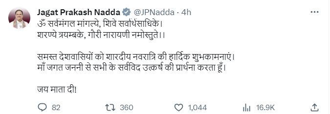 भाजपा अध्यक्ष जे.पी. नड्डा ने अपने शुभकामना संदेश में कहा, "ॐ सर्वमंगल मांगल्ये, शिवे सर्वार्थसाधिके। शरण्ये त्रयम्बके गौरी, नारायणी नमोस्तुते।। समस्त देशवासियों को शारदीय नवरात्र की हार्दिक शुभकामनाएं। माँ जगत जननी से सभी के सर्वविद उत्कर्ष की प्रार्थना करता हूँ। जय माता दी!"