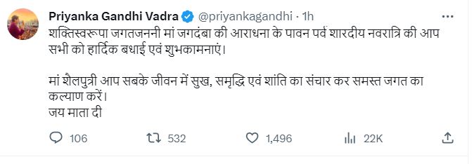 कांग्रेस महासचिव प्रियंका गांधी ने भी सोशल मीडिया पर नवरात्र की शुभकामनाएं देते हुए लिखा, 'शक्तिस्वरूपा जगतजननी मां जगदंबा की आराधना के पावन पर्व शारदीय नवरात्रि की आप सभी को हार्दिक बधाई एवं शुभकामनाएं। मां शैलपुत्री आप सबके जीवन में सुख, समृद्धि एवं शांति का संचार कर समस्त जगत का कल्याण करें। जय माता दी