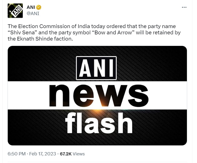 Election Commission today ordered that the party name “Shiv Sena” and the party symbol “Bow and Arrow” will be retained by the Eknath Shinde faction. pic.twitter.com/JankdFvBiK