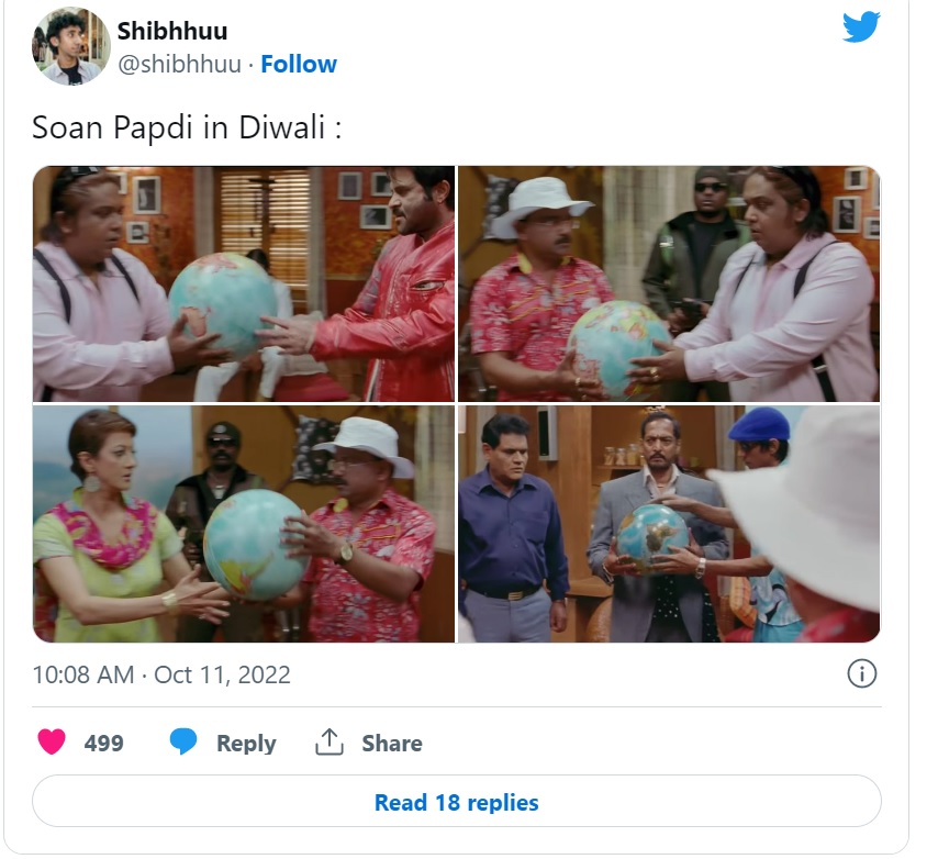 वहीं शिभु नाम के एक यूजर ने अक्षय कुमार की फिल्म वेलकम का एक सीन का इस्तेमाल कर सोन पापड़ी मीम बनाया है।फिल्म के स्टिल्स में वेलकम के एक्टर्स को पार्सल पास करते हुए दिखाया जा रहा है। इस खास मीम्स के साथ, सोशल मीडिया यूजर ने मजाक में कहा कि कैसे लोग सोन पापड़ी से छुटकारा पाने के लिए दिवाली पर एक-दूसरे को मिठाई पास करते हैं।