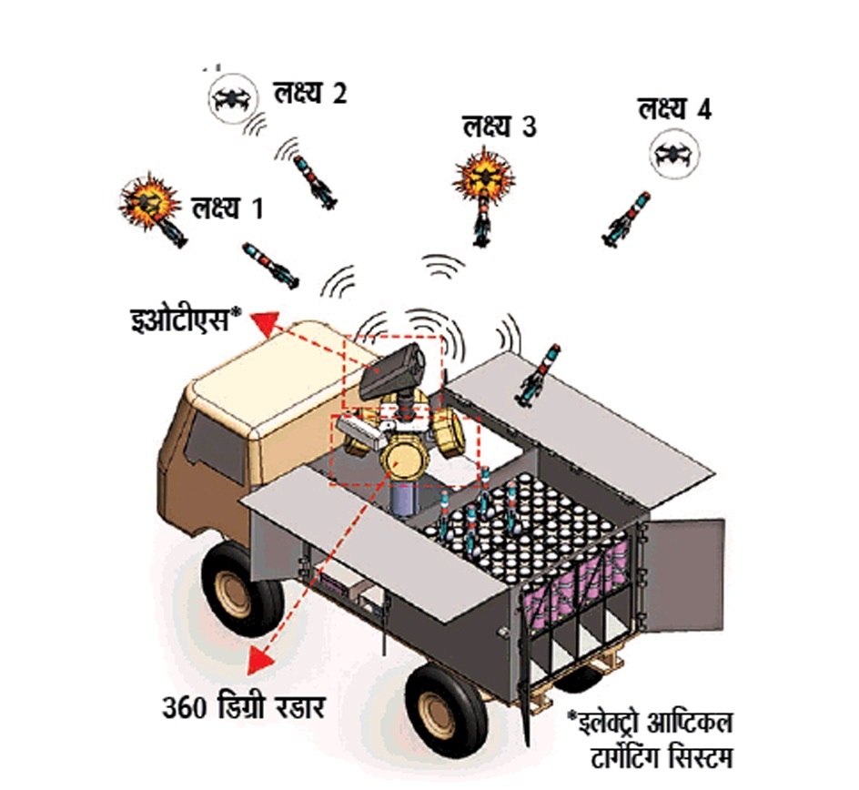 इकोनॉमिक एक्सप्लोसिव्स लिमिटेड का यह सिस्टम एक साथ 64 से ज्यादा माइक्रो मिसाइलें दाग सकता है। इसे एक मोबाइल प्लेटफॉर्म पर लगाया जाएगा ताकि इसे कहीं भी कम समय में पहुंचाया जा सके। इसे हर तरह के इलाके में काम करने के लिए बनाया गया है। ऊंचाई वाले इलाकों में भी यह काम कर सकता है।