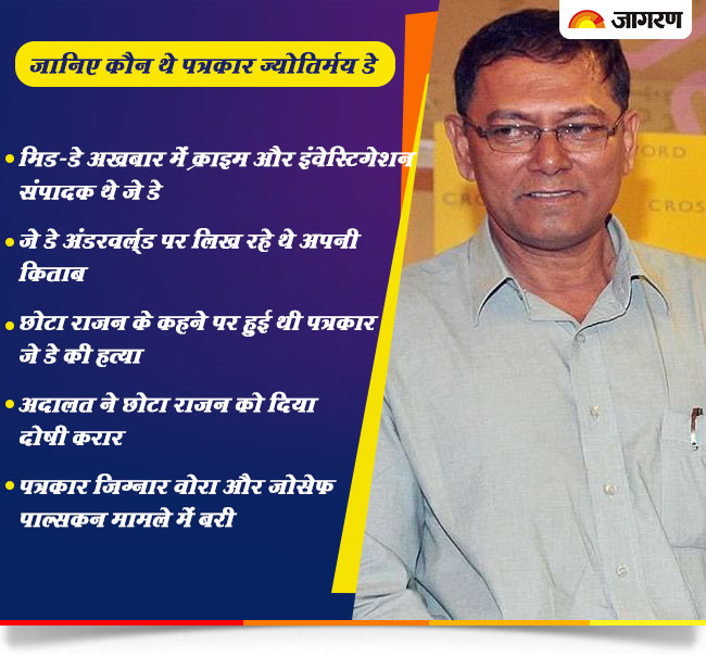पत्रकार ज्योतिर्मय डे की 11 जून 2011 को हत्या कर दी गई थी। इस मामले में पिछले सात साल से सुनवाई चल रही थी। इस बीच साल 2015 में छोटा राजन को इंडोनेशिया से गिरफ्तार कर लिया गया था। इसके बाद इस केस में सुनवाई तेज हुई। दिल्ली के तिहाड़ जेल में बंद छोटा राजन वीडियो कॉन्फ्रेंसिंग के जरिए मकोका कोर्ट में पेश होता रहा था। जांचकर्ताओं के अनुसार, छोटा राजन ने जे डे को मारने के निर्देश दिए थे।