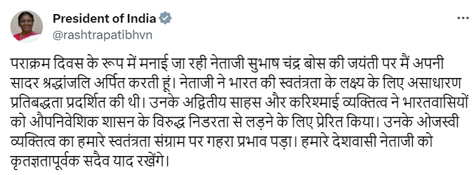 राष्ट्रपति द्रौपदी मुर्मु ने नेताजी को याद करते हुए सोशल मीडिया प्लेटफॉर्म एक्स पर एक पोस्ट किया।