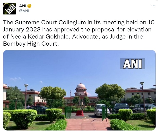 नई दिल्ली, एजेंसी। सुप्रीम कोर्ट कॉलेजियम ने 10 जनवरी 2023 को हुई अपनी बैठक में बॉम्बे हाई कोर्ट में न्यायाधीश के रूप में वकील नीला केदार गोखले की पदोन्नति के प्रस्ताव को मंजूरी दे दी है। इसके अलावा सुप्रीम कोर्ट कॉलेजियम ने मंगलवार को विभिन्न उच्च न्यायालयों के न्यायाधीशों के रूप में नौ व्यक्तियों के नामों को मंजूरी दी है। जिनमें सात न्यायिक अधिकारियों और दो वकीलों की नियुक्ति के प्रस्तावों को मंजूरी दे दी है।