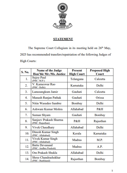 सुप्रीम कोर्ट कॉलेजियम ने 21 हाईकोर्ट जजों के तबादले की सिफारिश की है। मुख्य न्यायाधीश न्यायमूर्ति बी. आर. गवई की अध्यक्षता में हुई बैठक में यह फैसला लिया गया जिसका उद्देश्य उच्च न्यायपालिका में प्रशासनिक दक्षता बनाए रखना है। कॉलेजियम की सिफारिशों के बाद जजों के स्थानांतरण की प्रक्रिया शुरू होगी।
