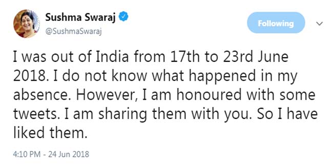 इस घटना के बाद कुछ यूजर ने सुषमा को टैग करते हुए आपत्तिजनक ट्वीट भी किए। सुषमा ने इसका बखूबी जवाब देते हुए एक ट्वीट भी किया। उन्होंने कहा, 'मैं 17 से 23 जून तक भारत से बाहर थी। मुझे नहीं पता कि मेरी गैरमौजूदगी में क्या हुआ। हालांकि कुछ ट्वीट्स से मैं सम्मानित महसूस हुई हूं। मैं उन्हें आपसे शेयर कर रही हूं इसलिए मैंने इसे लाइक किया है।'