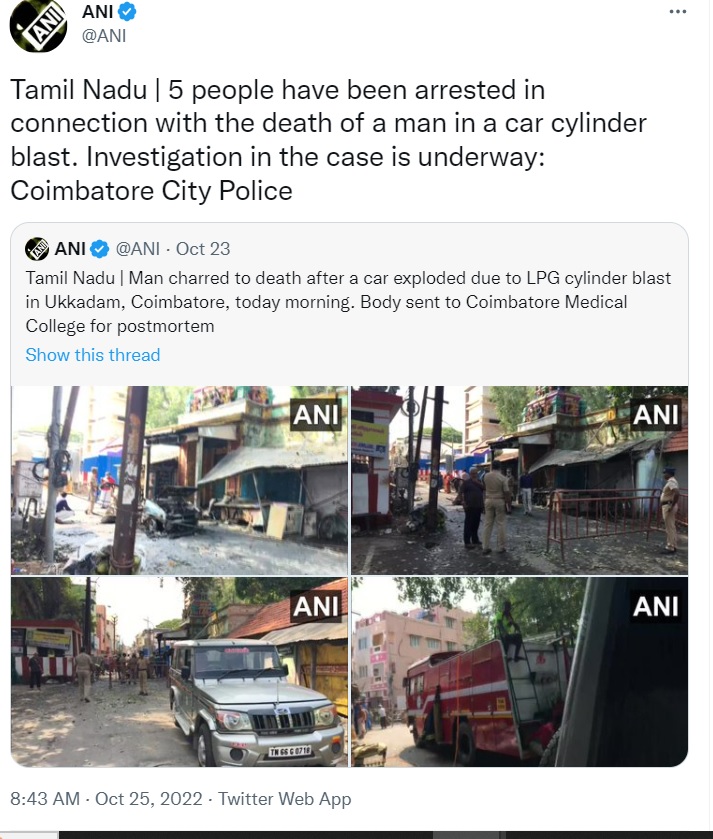 तमिलनाडु भारतीय जनता पार्टी के अध्यक्ष के अन्नामलाइ ने दावा किया कि यह आइएसआइएस लिंक के साथ एक आतंकवादी हमला था। अन्नामलाइ ने ट्विटर पर कहा, "कोयंबटूर सिलेंडर विस्फोट अब 'सिलेंडर विस्फोट' नहीं है। यह आइएसआइएस लिंक के साथ एक स्पष्ट आतंकवादी कृत्य है। हमले को 12 घंटे से ऊपर हो गए है। हमले को लेकर सवाल करते हुए उन्होंने कहा कि क्या यह राज्य की खुफिया मशीनरी और द्रमुक सरकार की स्पष्ट विफलता नहीं है?"