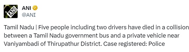 समाचार एजेंसी एएनआई के मुताबाकि, यह हादसा थिरुपाथुर जिले के वानीयंबाडी के पास हुआ। तमिलनाडु की सरकारी बस और एक निजी वाहन के बीच अचानक टक्कर हो गई। हादसा इतना भीषण था कि दो ड्राइवरों सहित पांच लोगों की मौके पर ही मौत हो गई है।