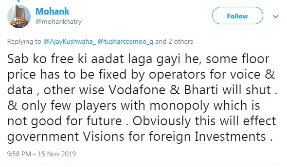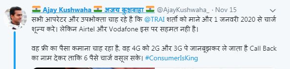 एक यूजर ने लिखा कि सभी आपरेटर चाहते है कि वह TRAI की शर्तें मानें और एक जनवरी 2020 से चार्ज शून्य करे। लेकिन, एयरटेल और वोडाफोन इस पर सहमत नहीं है।