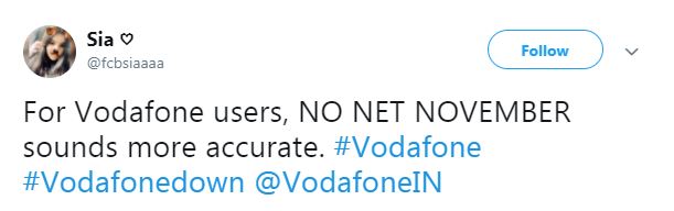 हालांकि, कई यूजर इसपर बड़े ही मजाकिया तरह से प्रतिक्रिया व्यक्त की। एक ने लिखा कि वोडाफोन यूजर्स के लिए नो नेट नवंबर ज्यादा सही रहेगा। इसी के साथ ट्विटर पर #switchtobsnl भी ट्रेंड करना लगा।