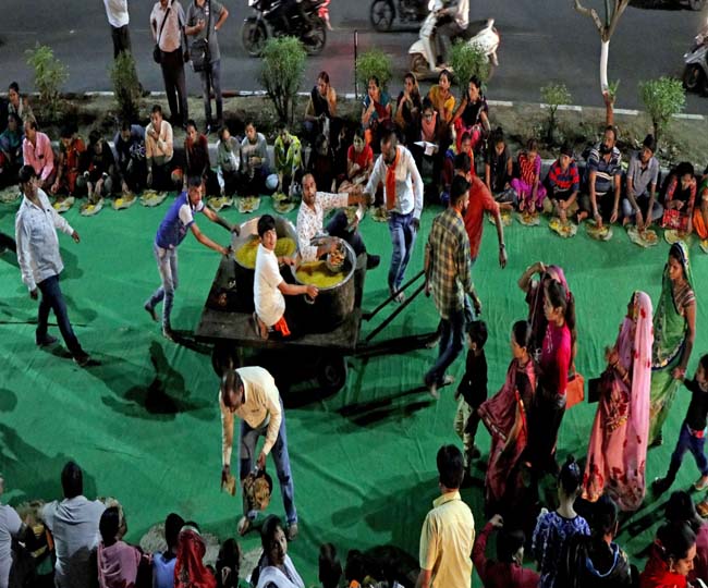 लोग हजारों-हजार के जत्थों में पहुंच रहे थे और अपनी बारी के इंतजार में सड़क के किनारे खड़े थे। व्यवस्था में जुटे हजारों लोग भी दौड़-दौड़कर लोगों को भोजन करवाने में जुटे थे। सात किमी सड़क पर एक साथ पांत बैठती। ई-रिक्शा, बाइक, लोडिंग रिक्शा जैसे वाहनों से खाना परोसा जा रहा था। 2 हजार डिब्बे शुद्ध घी, एक हजार क्विंटल आटा, 1 हजार क्विंटल चीनी, 500 क्विंटल सब्जी, 500 क्विंटल बेसन, 500 किलो मसालों से भोजन तैयार किया गया था।