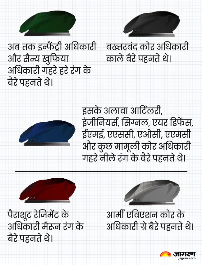 इसके अलावा आर्टिलरी, इंजीनियर्स, सिग्नल, एयर डिफेंस, ईएमई, एएससी, एओसी, एएमसी और कुछ मामूली कोर अधिकारी गहरे नीले रंग के बैरे पहनते थे। पैराशूट रेजिमेंट के अधिकारी मैरून रंग के कपड़े पहनते थे। आर्मी एविएशन कोर के अधिकारी ग्रे बैरे पहनते थे।