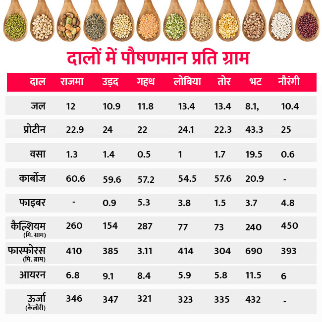 दालों में पौषणमान प्रति ग्राम