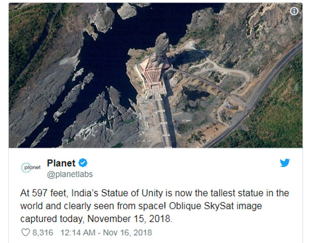 अमेरिका की कॉमर्शियल सेटेलाइट नेटवर्क प्लैनेट ने ‘स्टेच्यू ऑफ यूनिटी’ की एक तस्वीर अपने ट्विटर हैंडल पर पोस्ट की है। 15 नवंबर को ली गई ‘स्टेच्यू ऑफ यूनिटी’ की यह तस्वीर सोशल मीडिया पर लगातार वायरल हो रही है।