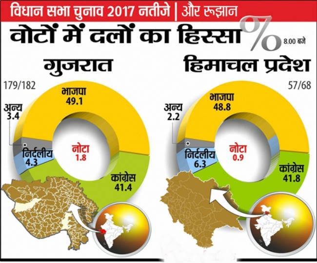 कांग्रेस अपने दम पर इस बार पीएम मोदी के गृहराज्य में उसको 99 पर समेटने में कामयाब रही है। वहीं उसके अपने खाते में 77 सीटें आई हैं और छह अन्य के खाते में गई हैं। वोट प्रतिशत की बात करें तो भी 2012 में हुए विधानसभा चुनाव की तुलना में इस बार कांग्रेस का वोट प्रतिशत बढ़ा है। वर्ष 2012 में कांग्रेस को जहां 38.9 फीसद वोट मिले थे वहीं इस बार 41.4 फीसद वोटिंग उसके पक्ष में हुई है। इसके अलावा भाजपा के पक्ष में वर्ष 2012 के विधानसभा चुनाव में 47.9 फीसद वोटिंग हुई इस बार यह 49.1 फीसद हुई।