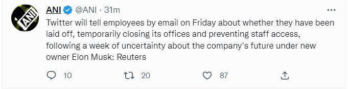 ट्विटर ने अपनी ई-मेल में कर्मचारियों से साफ कहा है कि ऑफिस को अस्थायी रूप से बंद किया जा रहा है और सभी एक्सेस वाले आईकार्ड को सस्पेंड कर दिया गया है, ताकि सुरक्षा को सुनिश्चित किया जा सके। इसके अलावा ट्विटर के सिस्टम और यूजर्स के डाटा को भी सुरक्षित करने की प्रक्रिया चल रही है। गौरतलब है कि मस्क ने ट्विटर को 44 अरब डॉलर में खरीदा है और इसका अधिग्रहण पूरा करने के बाद से ही लगातार बदलाव चल रहा है।