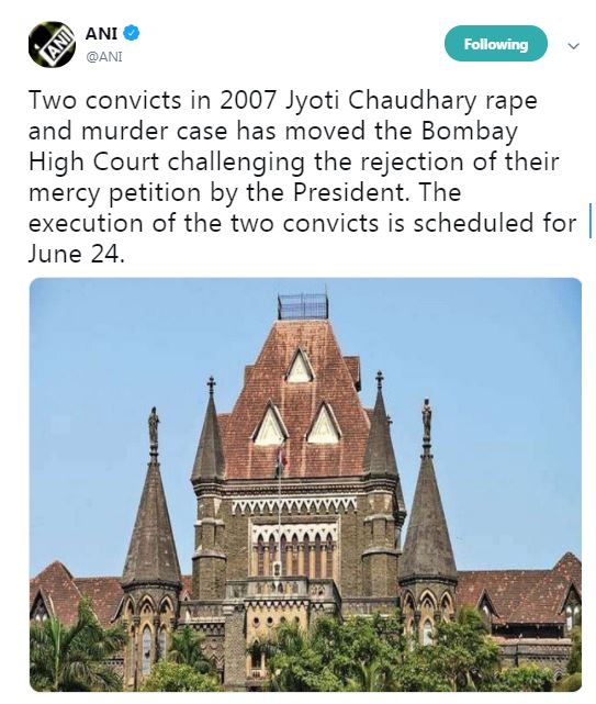 नई दिल्ली,एजेंसी। साल 2007 में ज्योति चौधरी के यौन उत्पीड़न और हत्या मामले में दो दोषियों ने राष्ट्रपति द्वारा उनकी दया याचिका अस्वीकृति को चुनौती देते हुए बॉम्बे उच्च न्यायालय का रुख किया है। जानकारी के लिए बता दें कि 24 जून को दोनों दोषियों को फांसी की सजा होनी है।