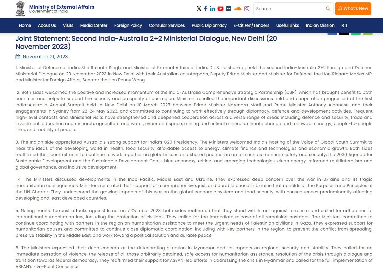भारतीय विदेश मंत्रालय ने भारत-ऑस्ट्रेलिया टू प्लस टू मंत्री स्तरीय वार्ता को लेकर ज्वाइंट स्टेटमेंट जारी किया। ज्वाइंट स्टेटमेंट में जानकारी दी गई कि दोनों देशों के बीच युद्ध सहित कई मुद्दों पर चर्चा हुई। वहीं युद्ध की वजह से पैदा मानवीय संकट से निपटने को लेकर भी चर्चा हुई। वैश्विक आर्थिक प्रणाली और खाद्य सुरक्षा को लेकर भी दोनों देशों के बीच बातचीत हुई।