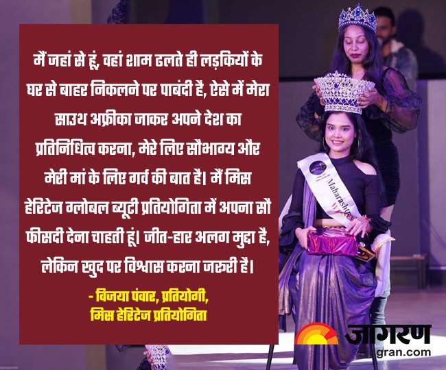 एक अगस्त से 18 सितंबर के बीच साउथ अफ्रीका के उत्तरी प्रांत लिम्पोपो में मिस हेरिटेज ग्लोबल ब्यूटी प्रतियोगिता का आयोजन हो रहा है। इसमें 50 देशों की कंटेस्टेंट भाग ले रहे हैं। भारत का प्रतिनिधित्व विजय पंवार कर रही हैं। इस प्रतियोगिता के लिए अभी ऑनलाइन वोटिंग हो रही है। इसमें जिन 20 सुंदरियों को सबसे ज्यादा वोट मिलेंगे, वे साउथ अफ्रीका में होने वाले मिस हेरिटेज के ग्रैंड फिनाले में शामिल होंगी।