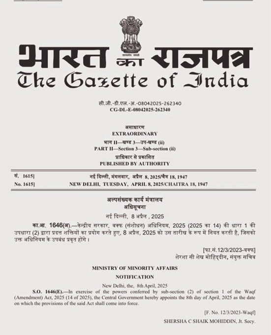 यह अधिसूचना भारत के राजपत्र (The Gazette of India) में प्रकाशित की गई है। अल्पसंख्यक कार्य मंत्रालय द्वारा जारी अधिसूचना के अनुसार, केंद्र सरकार ने संविधान प्रदत्त शक्तियों का उपयोग करते हुए अधिनियम की धारा 1 की उपधारा (2) के तहत 8 अप्रैल 2025 को वह तारीख घोषित की है जिस दिन से वक्फ (संशोधन) अधिनियम, 2025 के सभी प्रावधान प्रभावी हो जाएंगे।