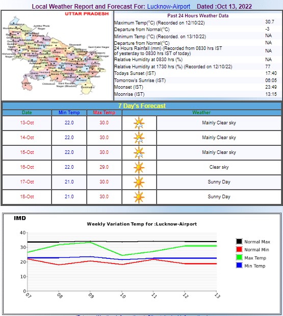 - लखनऊ- मौसम साफ रहेगा। चंद्रोदय समय शाम 07:58 बजे।