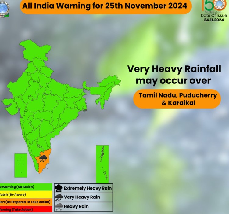 आज तमिलनाडु, पुडुचेरी और कराईकल में बहुत भारी बारिश होने की संभावना है। इसे लेकर मौसम विभाग की तरफ से ऑरेंज अलर्ट जारी किया गया है। वहीं 26 नवंबर को भी तमिलनाडु, पुडुचेरी और कराईकल में तेज बारिश का अलर्ट है। 27 नवंबर की अगर बात करें तो 27 को तमिलनाडु, पुडुचेरी , कराईकल, केरल, माहे, यनम और तटीय आंध्र प्रदेश में बारिश का अलर्ट है।