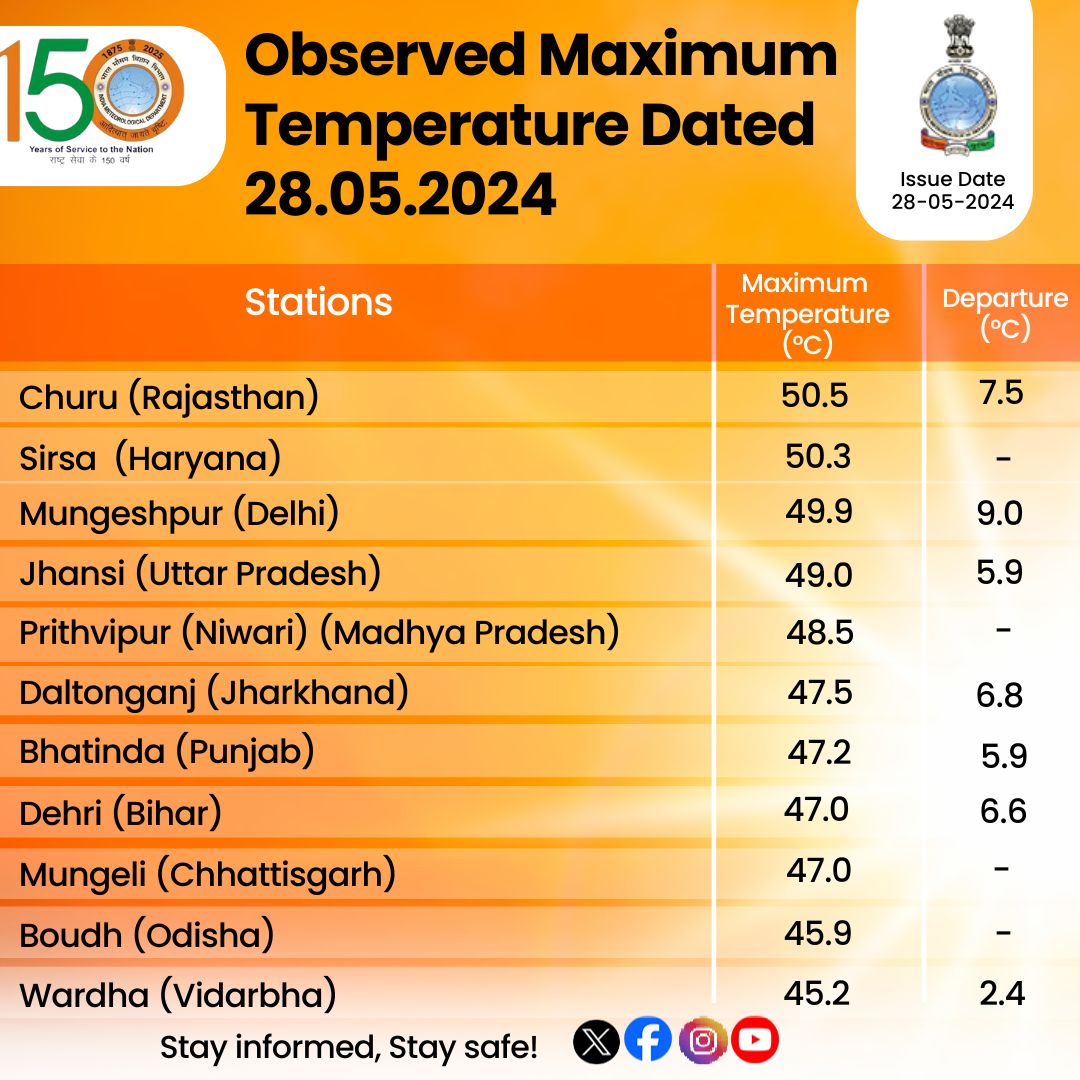 बात करें अन्य राज्यों की तो, राजस्थान के शहर चूरू ने तापमान में हाफ सेंचुरी मार दी है। जी हां, मंगलवार को यहां का तापामन 50.5 डिग्री सेल्सियस दर्ज किया गया। वहीं, हरियाणा के सिरसा का तापमान भी 50 के करीब पहुंचा। IMD के अनुसार, उत्तर प्रदेश, मध्य प्रदेश, झारखंड, बिहार, पंजाब, छत्तीसगढ़ और ओडिशा का तापमान 49 से 47 डिग्री सेल्सियस के ऊपर दर्ज किया गया।