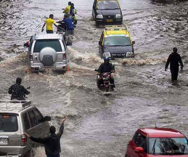 देश की आर्थिक राजधानी बारिश से बेहाल है। दो दिनों में यहां 540 मिलीमीटर (21 इंच से अधिक) पानी बरस गया। पिछले एक दशक में दो दिन में यह सर्वाधिक बरसात है। इससे महानगर का जनजीवन अस्त-व्यस्त हो गया है। हवाई, रेल, सड़क सभी यातायात बुरी तरह प्रभावित हुआ है। जगह-जगह जलभराव की स्थिति हो गई। कुछ जगहों पर घरों में पानी घुस गया। बिजली का करंट लगने से एक युवक की मौत हो गई।