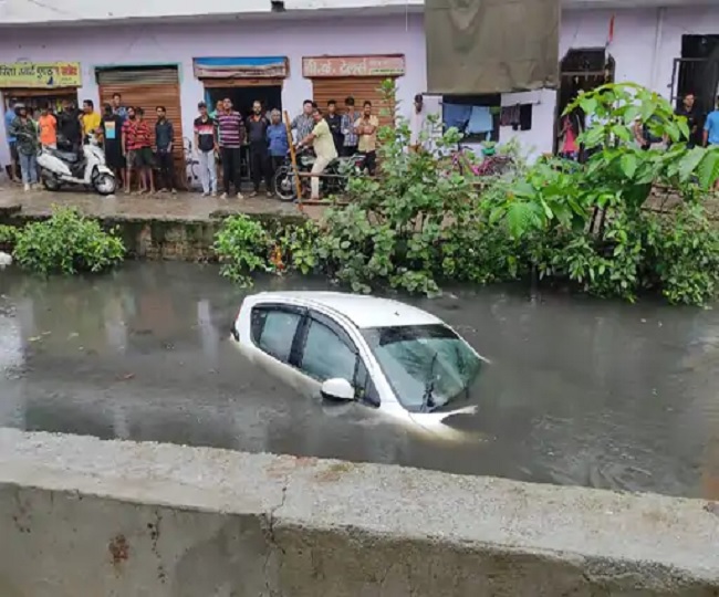 रविवार को यूपी के मेरठ में भारी बारिश के कारण नाले में फंसी कार