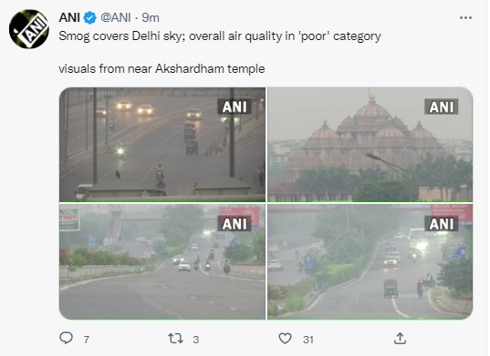 दिल्ली-एनसीआर की बात करें तो दिल्ली-एनसीआर की हवा में जहर घुलना शुरू हो गया है। दिल्ली-एनसीआर में लगातार 8वें दिन वायु प्रदूषण के बढ़ने का सिलसिला जारी है, जो सेहत के लिए बहुत खराब है। दिल्ली-एनसीआर में मौसम शुष्क बना हुआ है। हालांकि, ठंड का असर धीरे-धीरे बढ़ेगा। सुबह-शाम और रात में सर्दी के सितम में बढ़ोतरी होगी। सिस्टम ऑफ एयर क्वालिटी एंड वेदर फोरकास्टिंग एंड रिसर्च (SAFAR) के अनुसार दिल्ली में एयर क्वालिटी इंडेक्स (AQI) 266 (खराब) श्रेणी में है।