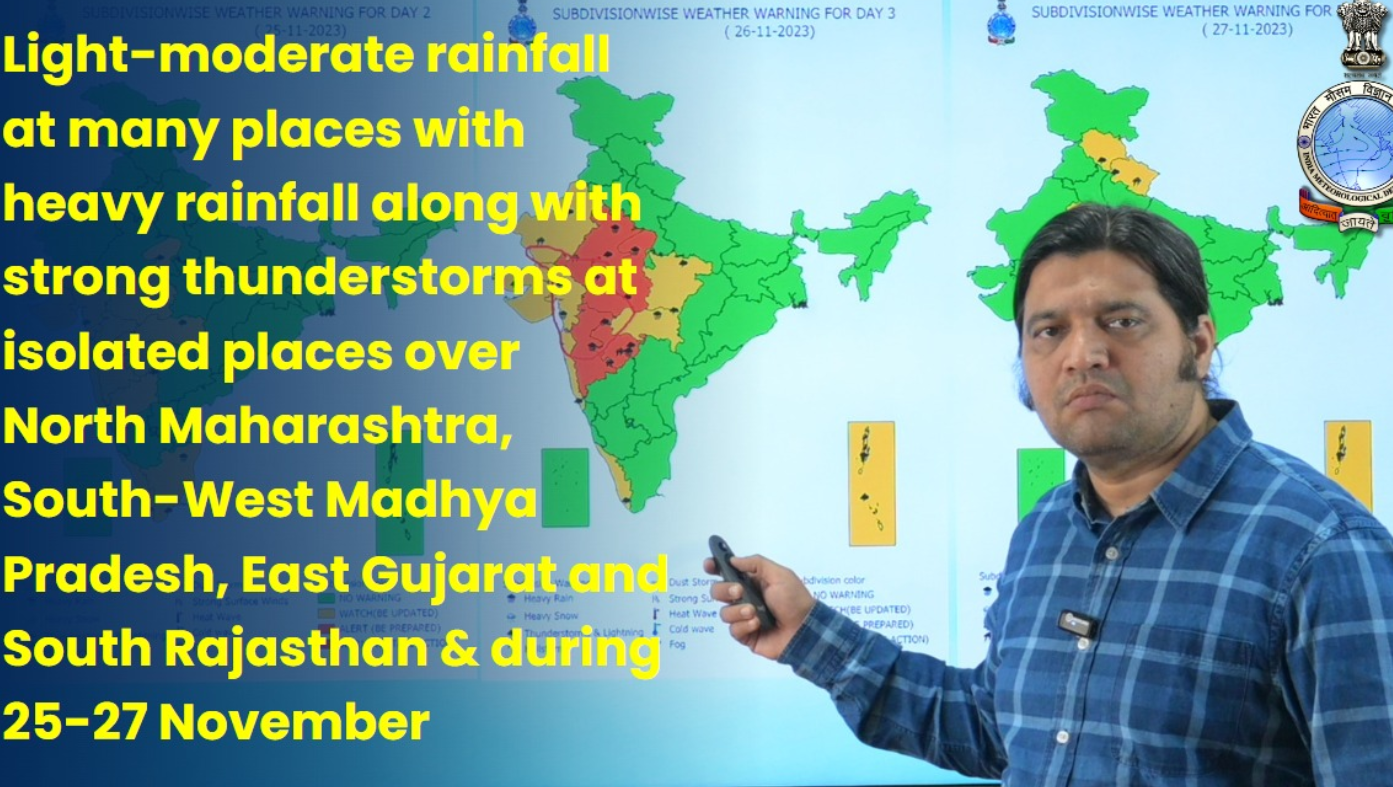 उत्तरी महाराष्ट्र, दक्षिण पश्चिम मध्य प्रदेश, पूर्व गुजरात और दक्षिण राजस्थान में 25 से 27 नवंबर के दौरान कई स्थानों पर हल्की से मध्यम बारिश, तेज गरज के साथ छिटपुट स्थानों पर भारी बारिश होने की संभावना है। बता दें कि दक्षिण प्रायद्वीपीय भारत में सबसे अधिक वर्षा दर्ज की गई है, जिसमें तमिलनाडु और केरल शामिल है। IMD ने उत्तरी केरल, तमिलनाडु और माहे के लिए ऑरेंज अलर्ट जारी किया है। वहीं, अगले दो दिनों में महाराष्ट्र, मध्य प्रदेश, गुजरात और दक्षिण राजस्थान में भारी बारिश होने की संभावना है।