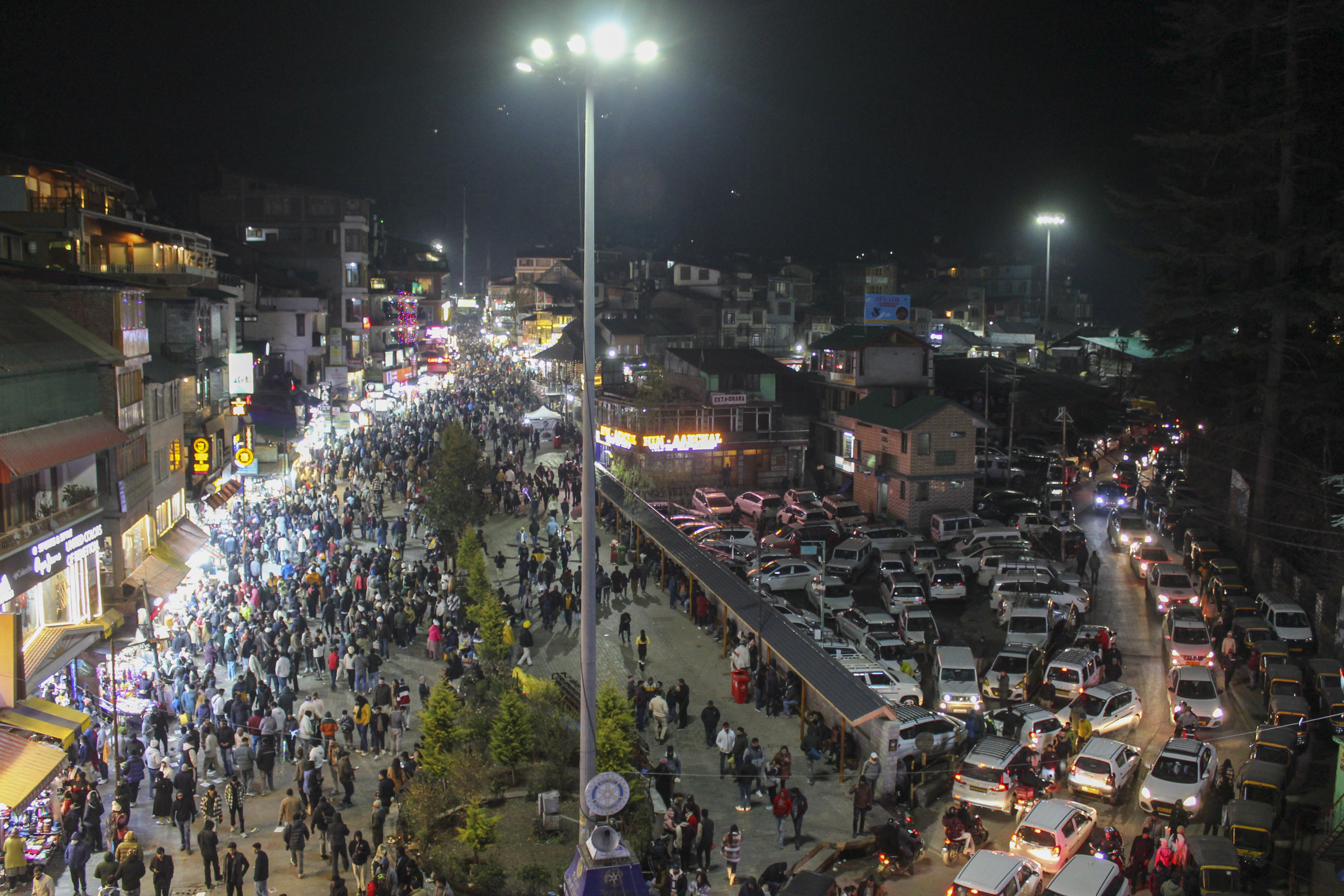 हिमाचल प्रदेश के कुल्लू जिले के मनाली में नए साल 2025 की पूर्व संध्या पर जश्न मनाने के लिए पर्यटक एकत्रित हुए और नए साल का शानदार स्वागत किया।