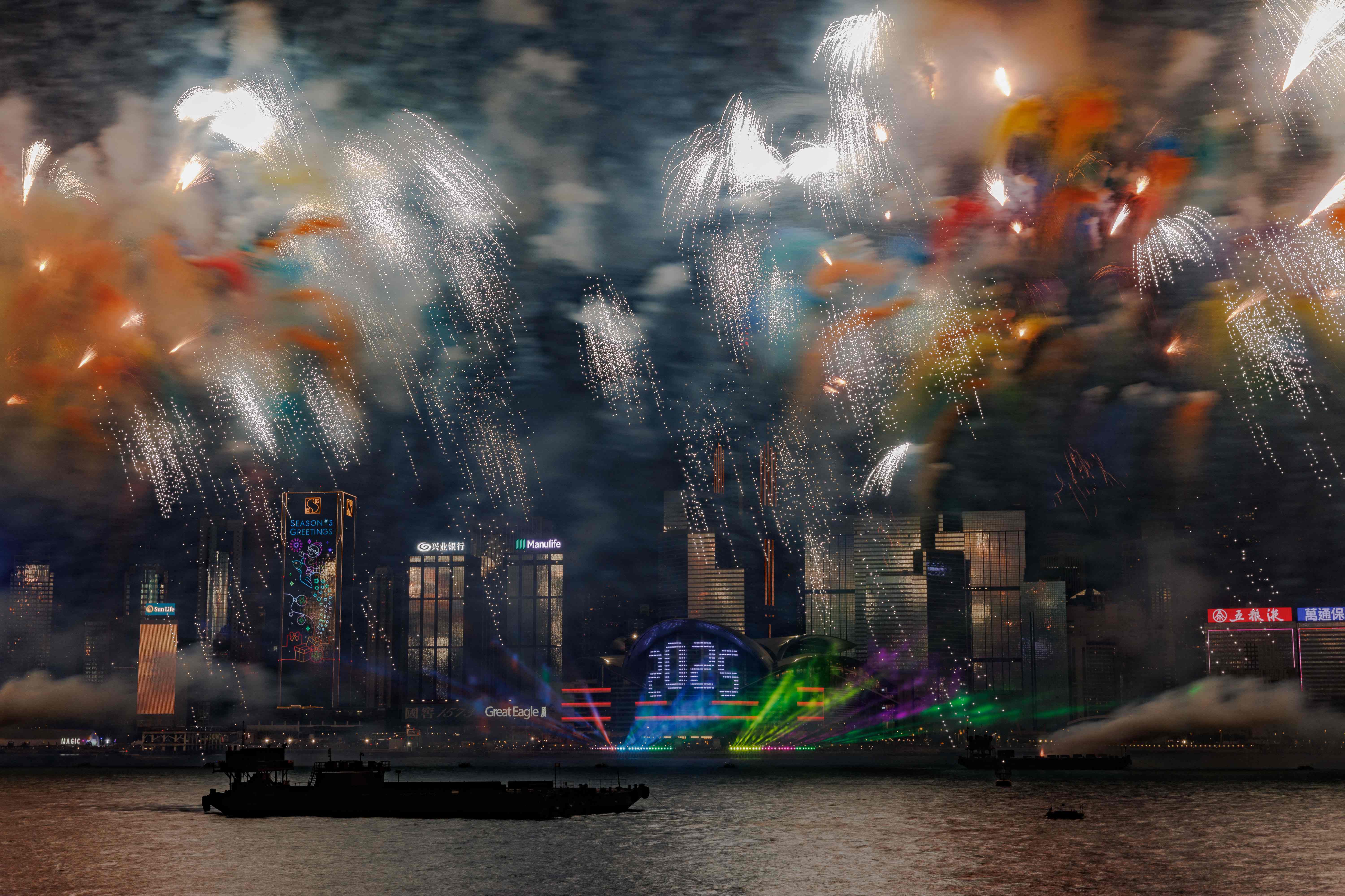हांगकांग में 2025 के नए साल के जश्न के दौरान विक्टोरिया हार्बर के ऊपर आधी रात को आतिशबाजी से आसमान जगमगा उठता है।
